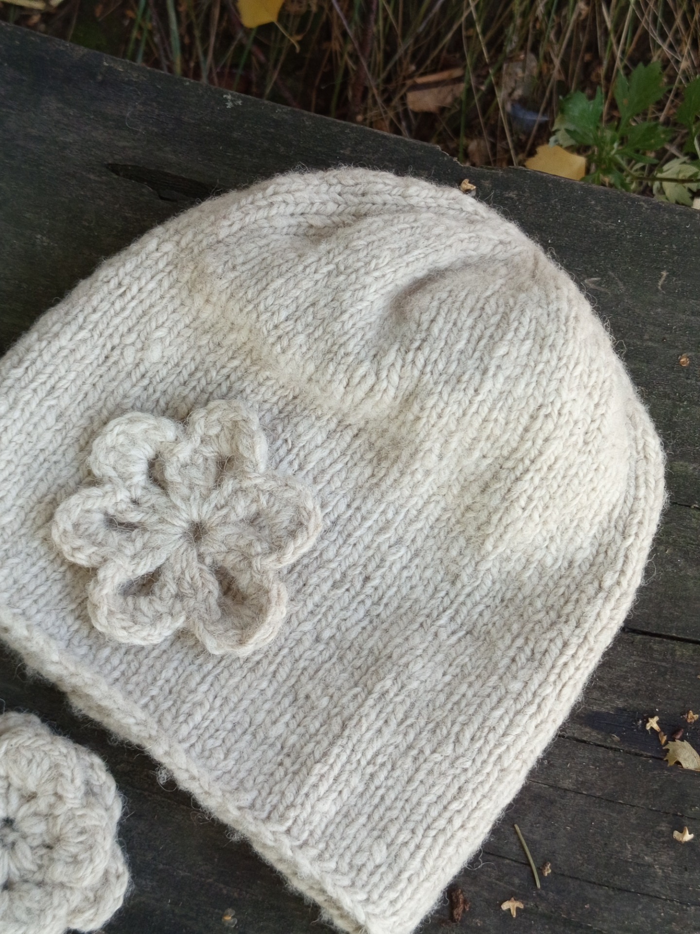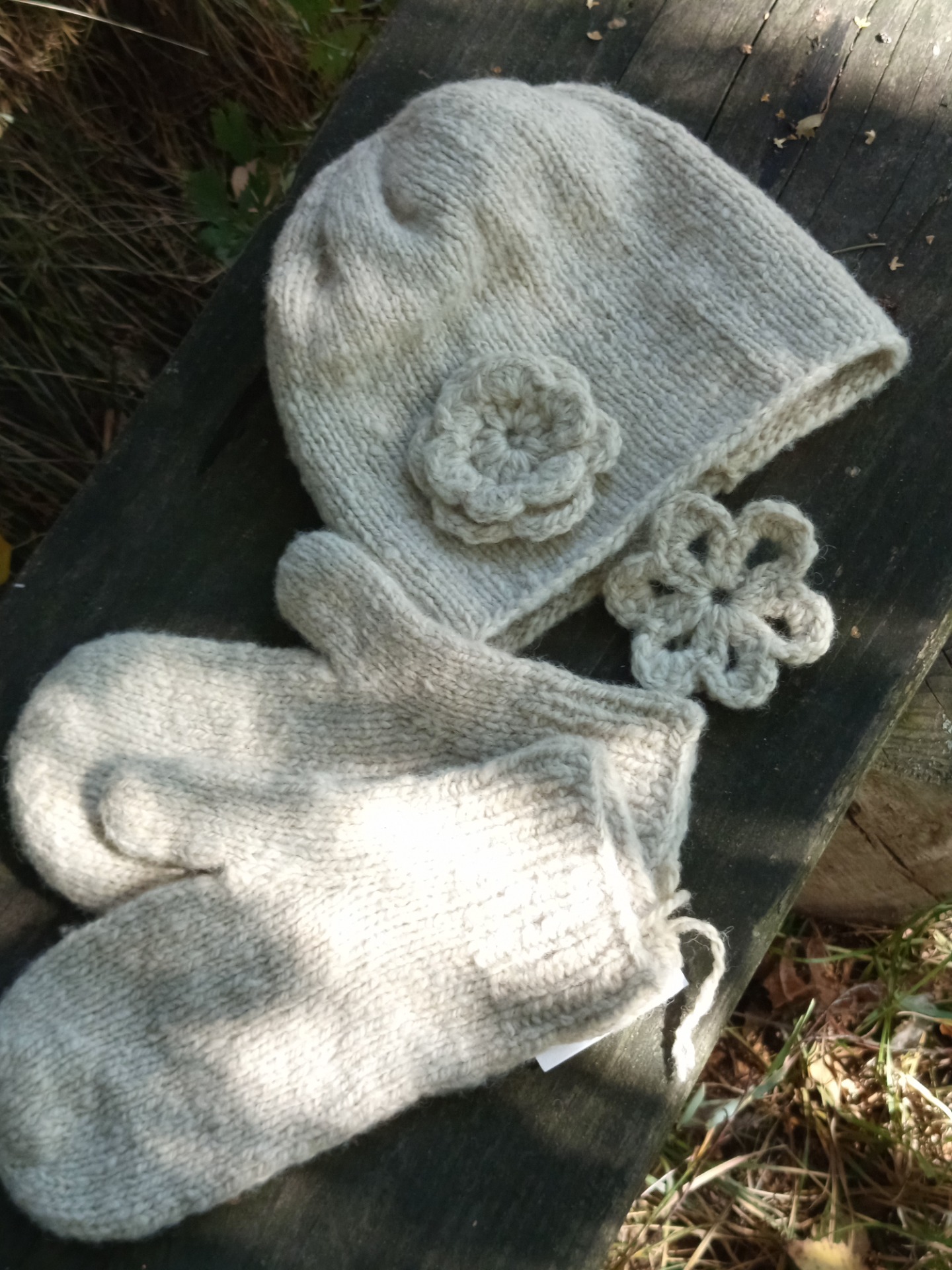 Vlnu na tuto čepici jsem kompletně ručně zpracovala od ostříhání ovečky Bětky až po upletení. Bětka je shetlandská ovečka s krásnou jemnou vlnou smetanové barvy. Z její vlny vznikly i další výrobky, které k sobě hezky ladí, například hladce pletené rukavice na další fotografii (odkaz na produkt zde ). Kytičku na čepici si můžete vybrat.